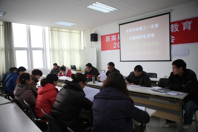按照西南科大党委群组发[2013]14号《关于在党的群众路线教育实践活动中开好专题民主生活会和组织生活会的通知》要求,2014年1月3日,成网学院党总支的两个党支部召开了以“立足岗位、转变作风,做好管理服务工作”为主题的专题组织生活会。会前,每一位党员都在认真学习、认真查摆、认真剖析的基础上,撰写了个人的对照检查材料。在会上,大家逐一严肃认真地进行了对照剖析,开展了批评与自我批评,提出了努力方向和改进措施。成网学院的领导班子成员、党的关系在成网学院党总支的正校级调研员朱强同志,均以普通党员的身份,分别参加了所在党支部的专题组织生活会。