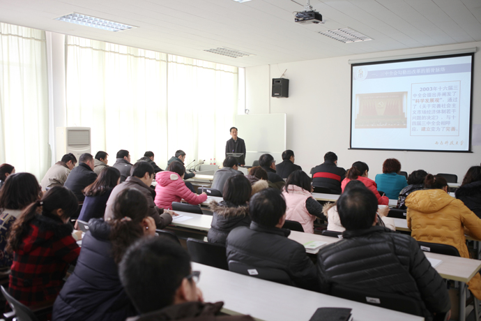 朱强同志紧紧围绕党的十八届三中全会内容精神,回顾了党从十一届三中全会开启了走向变革的伟大航程,改变了中国,影响了世界,并从“三中全会勾勒出改革的筋骨脉络、发展起来以后的问题一点不比不发展时少、改革之路怎么走、决定当代中国命运的关键一招、没有比人更高的山,没有比脚更长的路”等五方面进行了讲述。重点阐述了十八届三中全会是有史以来第一次将政治、经济、社会、文化、生态文明和党的建设统筹考虑、系统谋划;提出了深化改革要注重系统性、整体性、协同性,牢固树立进取意识、机遇意识、责任意识;深刻分析了十八届三中全会提出的深化教育领域综合改革,创新高校人才培养机制,促进高校办出特色争创一流和推进学前教育、特殊教育、继续教育改革发展的要求。他强调:面对大好的机遇和挑战,学院如何按照学校提出的“紧紧围绕试行普通高校、高职院校、成人高校之间学分互换,深化继续教育体制改革,探索适应社会需要的、多种形式学习成果转化认定制度,深入探讨联动机制和实现路径”要求,在认真研究分析总结上下功夫,做实、做细各项工作。