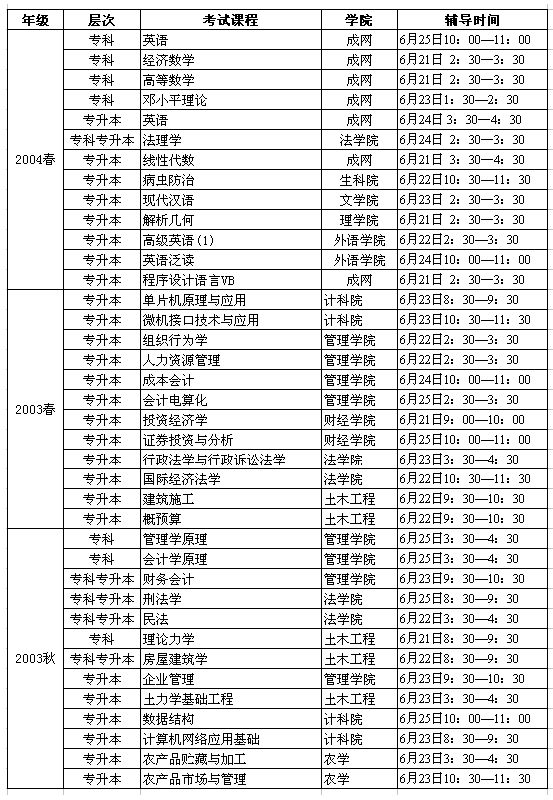 各学院、各学习中心: 期末临近,请各学院按安排时间指派教师做好辅导答疑工作。各学习中心做好教学安排,可于6月25日按技术媒体部的通知进行资料下载。 金年会jinnianhuicom网络学院教务科 2004-6-21