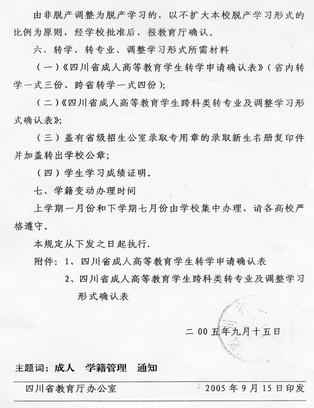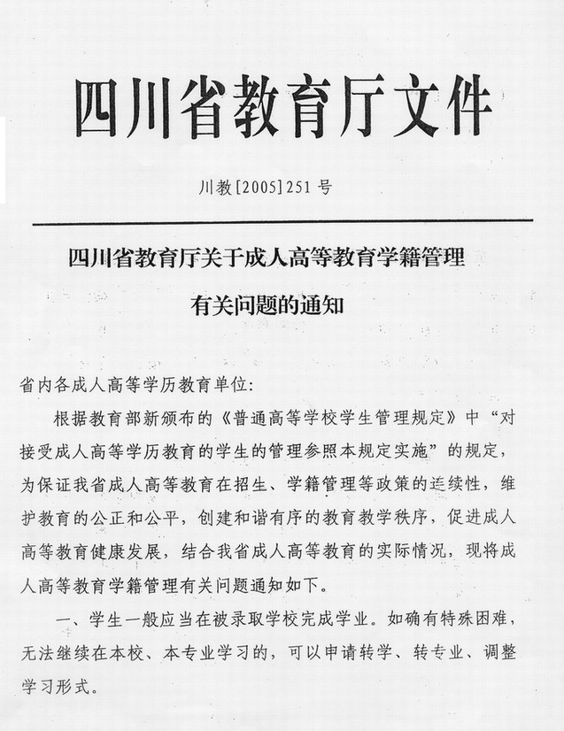现将《四川省教育厅关于成人高等教育学籍管理有关问题的通知》(川教[2005] 251号)转发给你们,请认真学习、遵照执行,并注意以下事项: