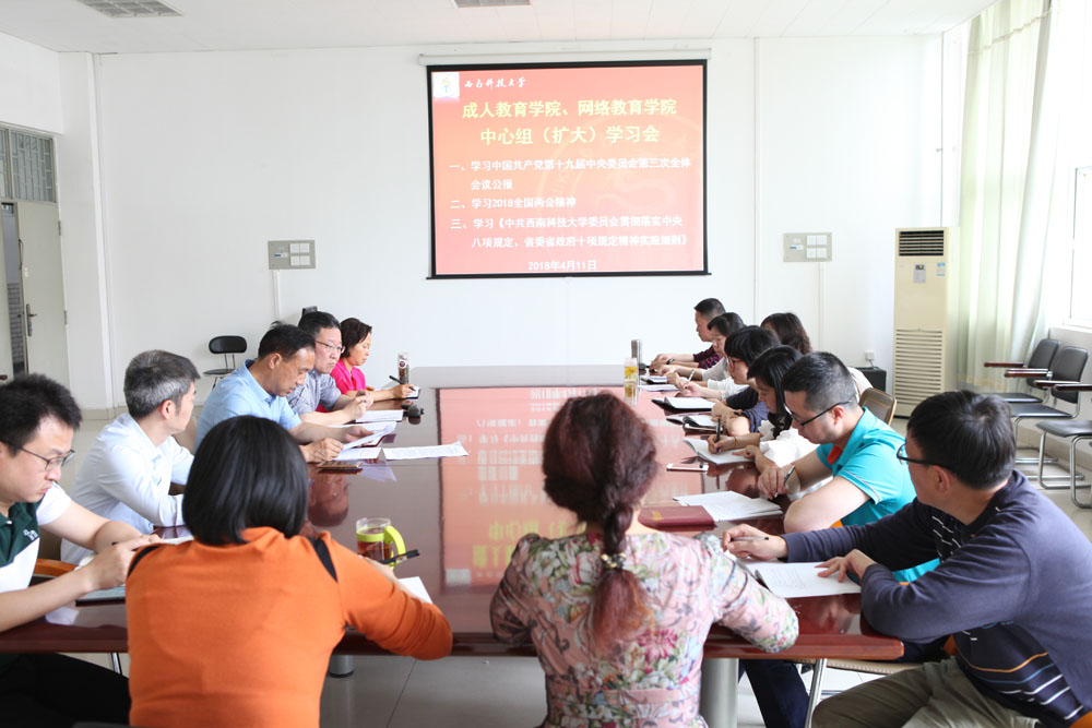 王天恒组织与会成员共同学习了《中国共产党第十九届中央委员会第三次全体会议公报》、2018年全国两会精神的重大意义和重点内容、《中共金年会jinnianhuicom委员会贯彻落实中央八项规定、省委省政府十项规定实施细则》,并就如何贯彻落实好党的十九届三中全会和2018全国两会精神对与会成员提出了要求:一是深刻领会精神实质,牢固树立“四个意识”;二是按照学校高质量发展要求,落实好继续教育立德树人的任务;三是真抓实干促发展,按照学校党委《贯彻落实中央八项规定、省委省政府十项规定精神实施细则》的要求,按照规定开展好学院各项工作;四是加强党的建设,充分发挥学院党支部和党员骨干的模范带头作用,进一步提升学院工作水平。