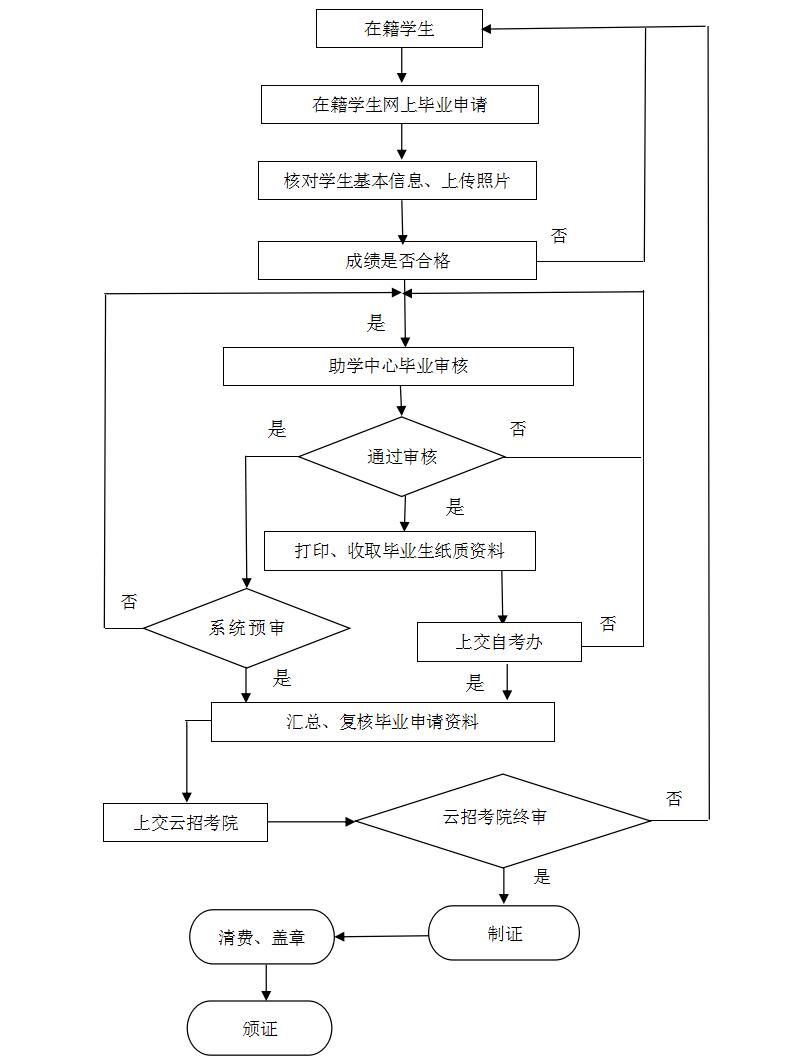 主考院校组织各助学中心,5(11))月办理免考手续。6(12)月1日前,导入省考、实践、毕业设计成绩到申请毕业的系统内。全程指导各助学中心进行办理毕业工作,出现问题,及时与云南招考院进行沟通并解决问题。