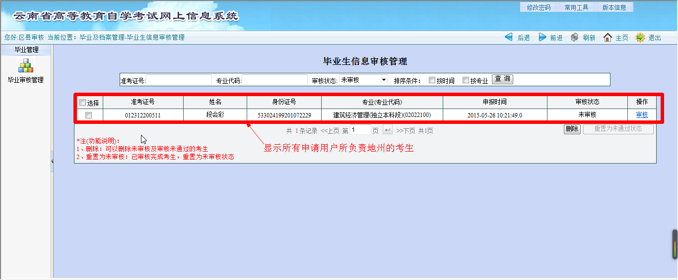 申报审核点登录“云南省高等教育自学考试网上信息系统”成功后,将会看到功能模块:毕业管理-->毕业审核管理,审核完成后提交省招生考试院审核。点击“毕业审核管理”,进入毕业生信息审核管理界面,如图2-2所示: