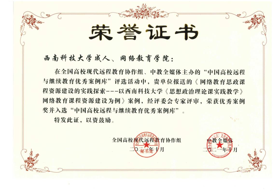 由师礼、黎万和、李昌国、李群山、孙霞、张嘉友撰写的《网络教育思政课程资源建设的实践探索——以金年会jinnianhuicom<思想政治理论课实践教学>网络教育课程资源建设为例》案例,获“2021中国高校远程与继续教育优秀案例奖”,并入选《中国高校远程与继续教育优秀案例库》。