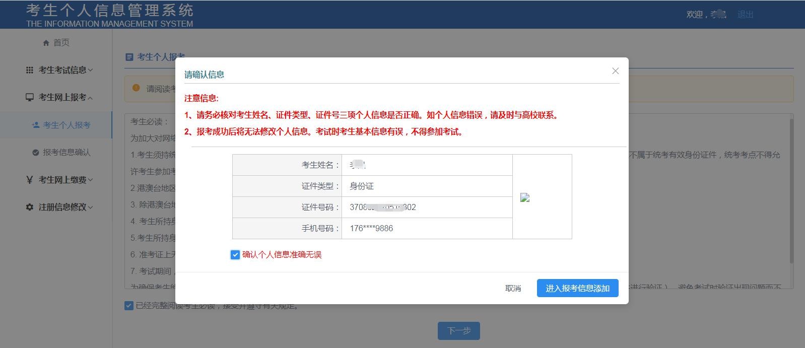 (2)进行“考生个人报考”操作。点击左边菜单栏的“考生个人报考” 后,点击“进入报考信息添加”,如下图: