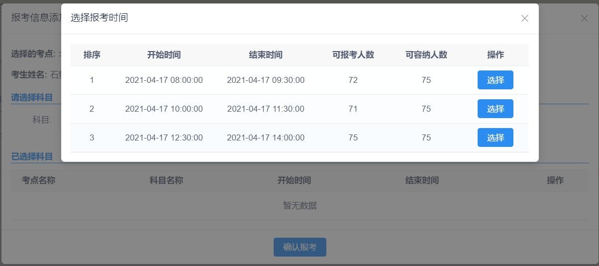 在此界面,考生可查看到当前的报考时间,以及考场某一科目可报考人数及可容纳人数,考生可根据自己的时间选择考试显示时间内的某一时刻进行考试。点击“选择”进行对科目进行报考。