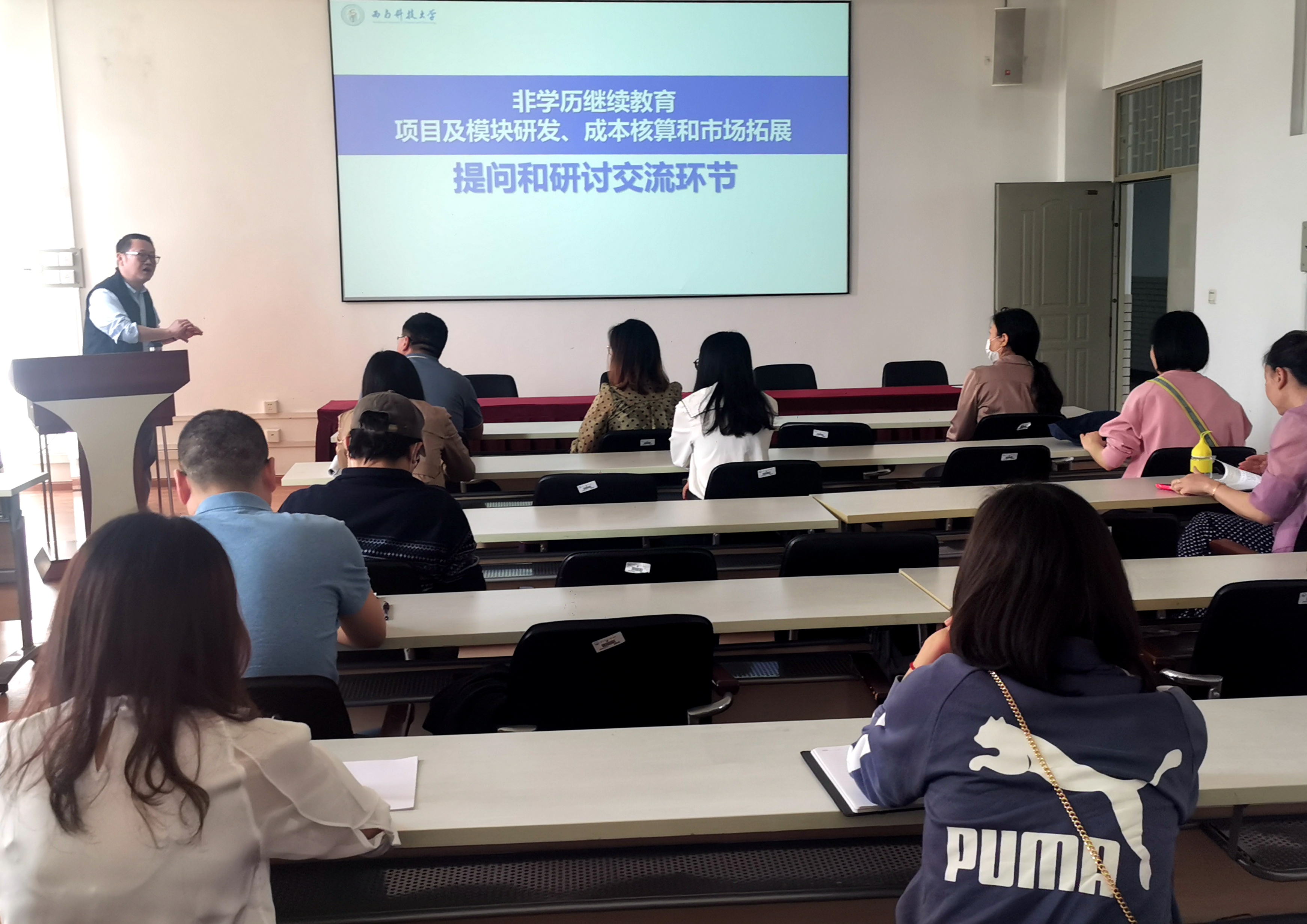 本次培训以“非学历教育(培训)项目及模块研发、成本核算和市场拓展”为主题。着重分析非学历教育(培训)面临的需求、机遇、现状和挑战;以掌握主动、突出特色、“内外兼修”为出发点,分析了非学历教育(培训)项目(模块)开发的6个环节;通过分析其他高校的成功经验,就采取建设基地、多维一体化项目研发与实施等方式推进非学历教育(培训)集约化发展提出了建议;从特色化行业拓展、精准化区域拓展、学历和非学历融合发展、协同共赢、构筑交融贯通的服务体系等方面提出了非学历教育(培训)市场拓展思路和措施;以实例分析的方式,介绍了项目成本核算的要素、关键点,以及周边辅助设施的价格和成本优化途径。