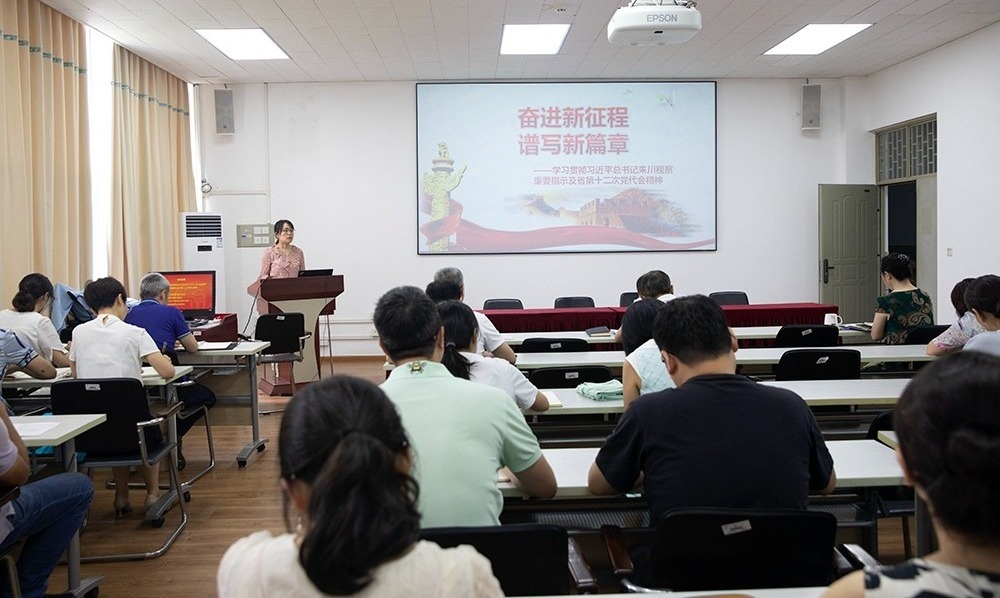 学院教工第二党支部宣传委员田金可同志以《奋进新征程、谱写新篇章——学习贯彻习近平总书记来川视察重要指示及省第十二次党代会精神》为题展开。田金可同志首先带领大家回顾了习近平总书记在四川眉山市、宜宾市考察之行,学习了习近平总书记来川视察重要指示精神,并分别从高举思想旗帜、勇担时代使命、突出战略引领、把握重点任务、强化根本保证等方面带领大家学习了四川省第十二次党代会精神。
