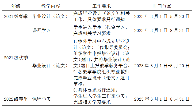 根据学校教学工作总体安排,本学期网络教育教学工作于2023年3月1日开始,至2023年8月31日结束。现将各年级有关教学工作的安排通知如下: