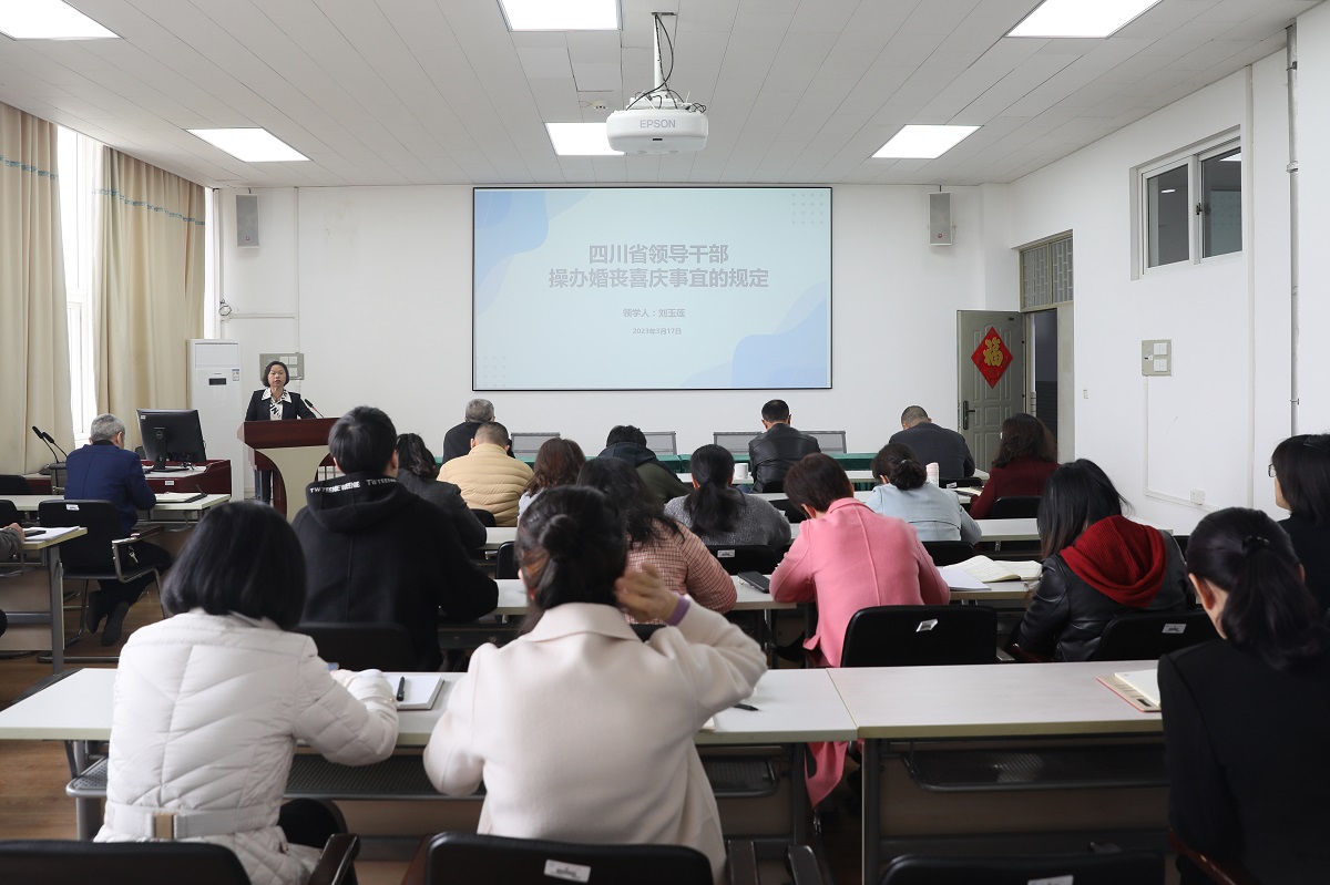 第二阶段,刘玉莲带领大家研习《四川省领导干部操办婚丧喜庆事宜的规定》,针对操办事项范围、涉猎人员、具体行为、操办理念等进行了仔细解读。随后,通报四川省纪委关于违反中央八项规定精神典型问题的案例,开展了警示教育。