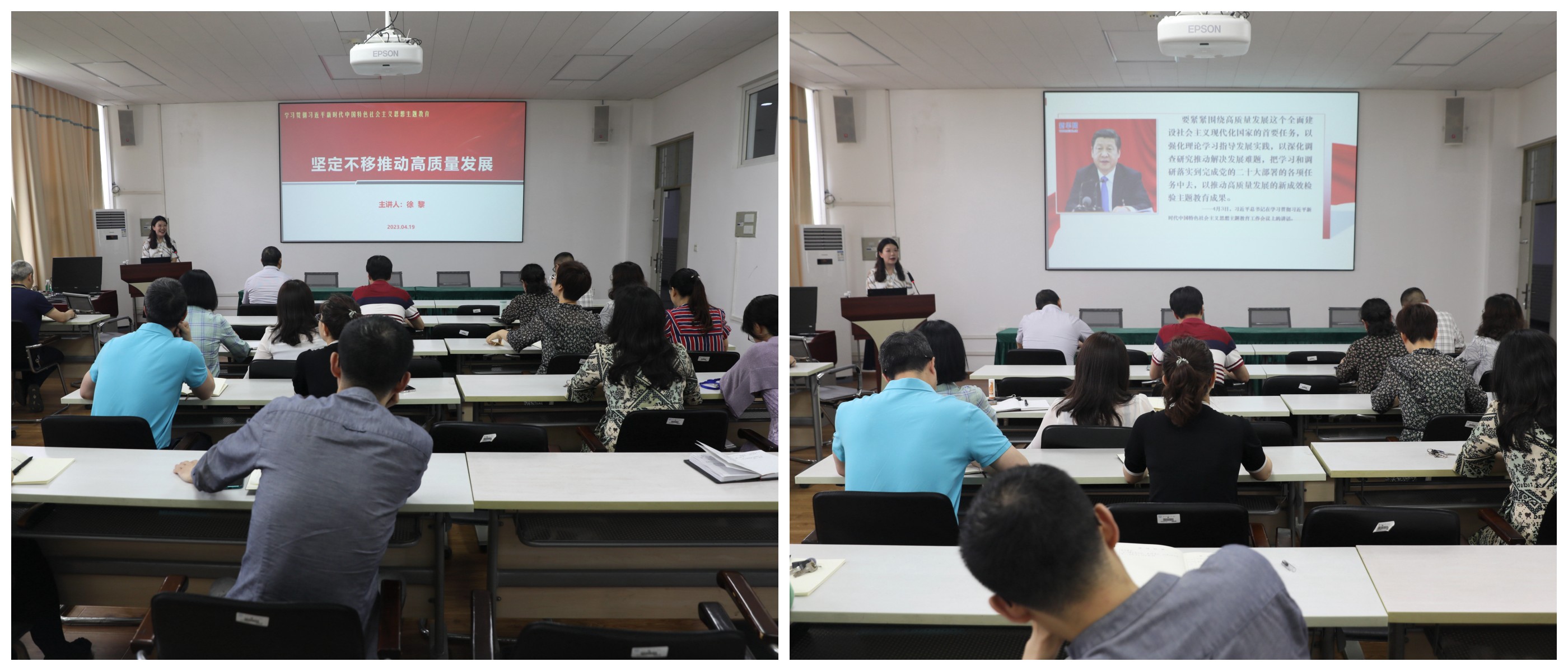 为深入学习贯彻习近平新时代中国特色社会主义思想,4月19日,学院邀请马克思主义学院徐黎副教授以“坚定不移推动高质量发展”为题为全体教职员工上了一堂生动的政治理论辅导课。