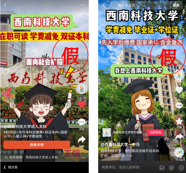 严正警告使用抖音、今日头条、网站等一切形式进行虚假宣传的发布者和媒体尽快删除虚假招生宣传信息。我们将通过法律手段维护学校声誉、追究违法者的法律责任。如涉事者为我校授权的校外教学点(助学中心),一经查实将从严从重处理。