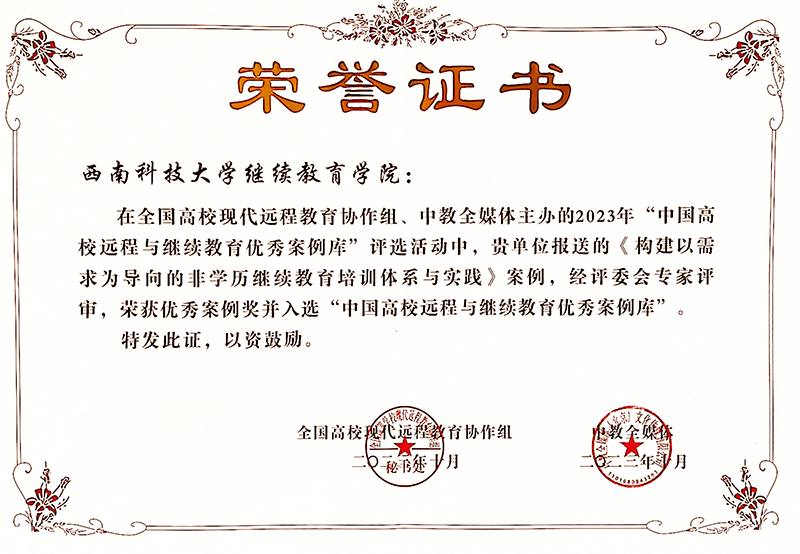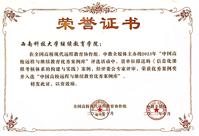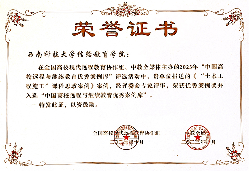 会上还隆重举行了“2023中国高校远程与继续教育优秀案例库”评选活动颁奖典礼,古松等申报的《“土木工程施工”课程思政案例》、冉利龙等申报的《信息化课程考核体系的构建与实践》、苏波等申报的《构建以需求为导向的非学历继续教育培训体系与实践》3个案例获得“2023中国高校远程与继续教育优秀案例奖”,并入选“中国高校远程与继续教育优秀案例库”。