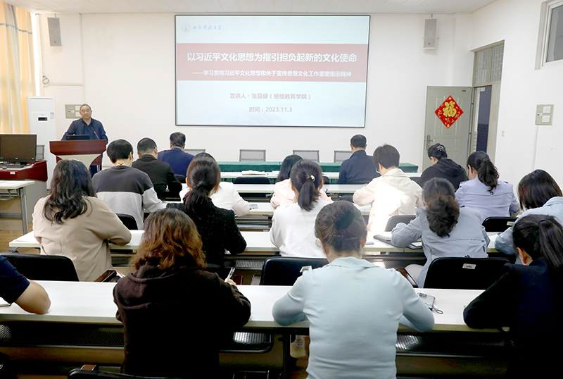 习近平文化思想是新时代文化建设方面的新思想新观点新论断,内涵十分丰富、论述极为深刻。张昌健围绕深刻把握习近平文化思想、新时代宣传思想文化工作的成就与挑战、担负起新的文化使命三方面内容系统阐述了习近平文化思想和关于宣传思想文化工作重要指示精神,以及高校发挥优势传承发展中华优秀传统文化、担负新的文化使命的实施路径。他指出,高校是文化高地,是育人主阵地,是党的意识形态工作的重要领域,在新时代文化建设中具有举足轻重的地位。他要求,作为高校教师,要结合工作实际,深刻体会做好宣传思想文化工作的极端重要性,坚持不懈促进高校和谐稳定,培育优良校风和学风,确保习近平文化思想和宣传思想文化工作重要指示精神落到为学生学习服务实处,自觉为学校继续教育事业发展贡献力量。
