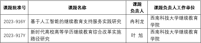 日前,中国成人教育协会发布了《关于公布中国成人教育协会“十四五”成人继续教育科研规划2023年度课题立项的通知》,我院组织申报的继续教育研究课题有2项获批“一般课题”立项,其中包括“基于人工智能的继续教育支持服务实践研究”“新时代高校高等学历继续教育综合改革实施路径研究”。