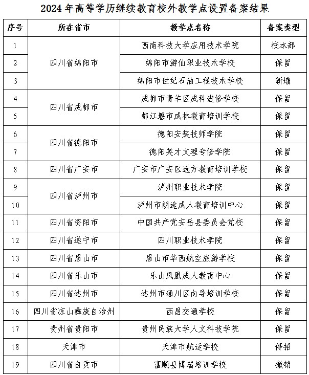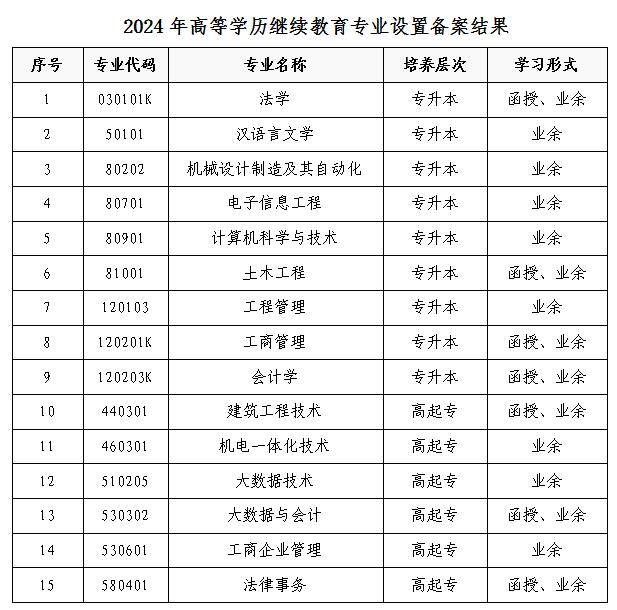 根据教育部公布的2024年高等学历继续教育专业和校外教学点设置备案结果,我校共有15个专业(高起专6个,专升本9个)以及16个校外教学点(保留15个,新增1个)通过教育部备案。另外,我校1个校外教学点备案“停招”,1个校外教学点备案“撤销”。现予以公告。