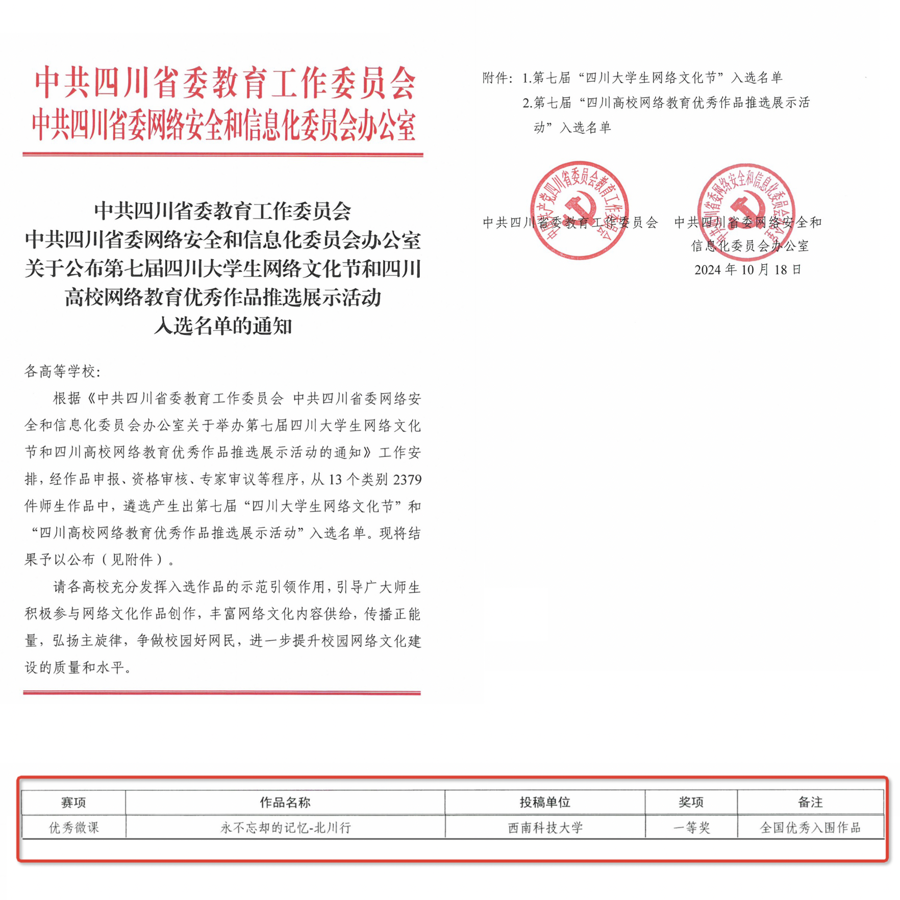 近日,中共四川省委教育工作委员会、中共四川省委网络安全和信息化委员会办公室公布了“第七届四川大学生网络文化节和四川高校网络教育优秀作品推选展示活动入选名单”,我院报送的优秀微课作品《永不忘却的记忆—北川行》荣获一等奖。