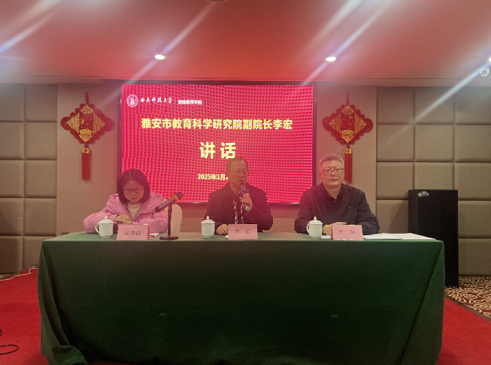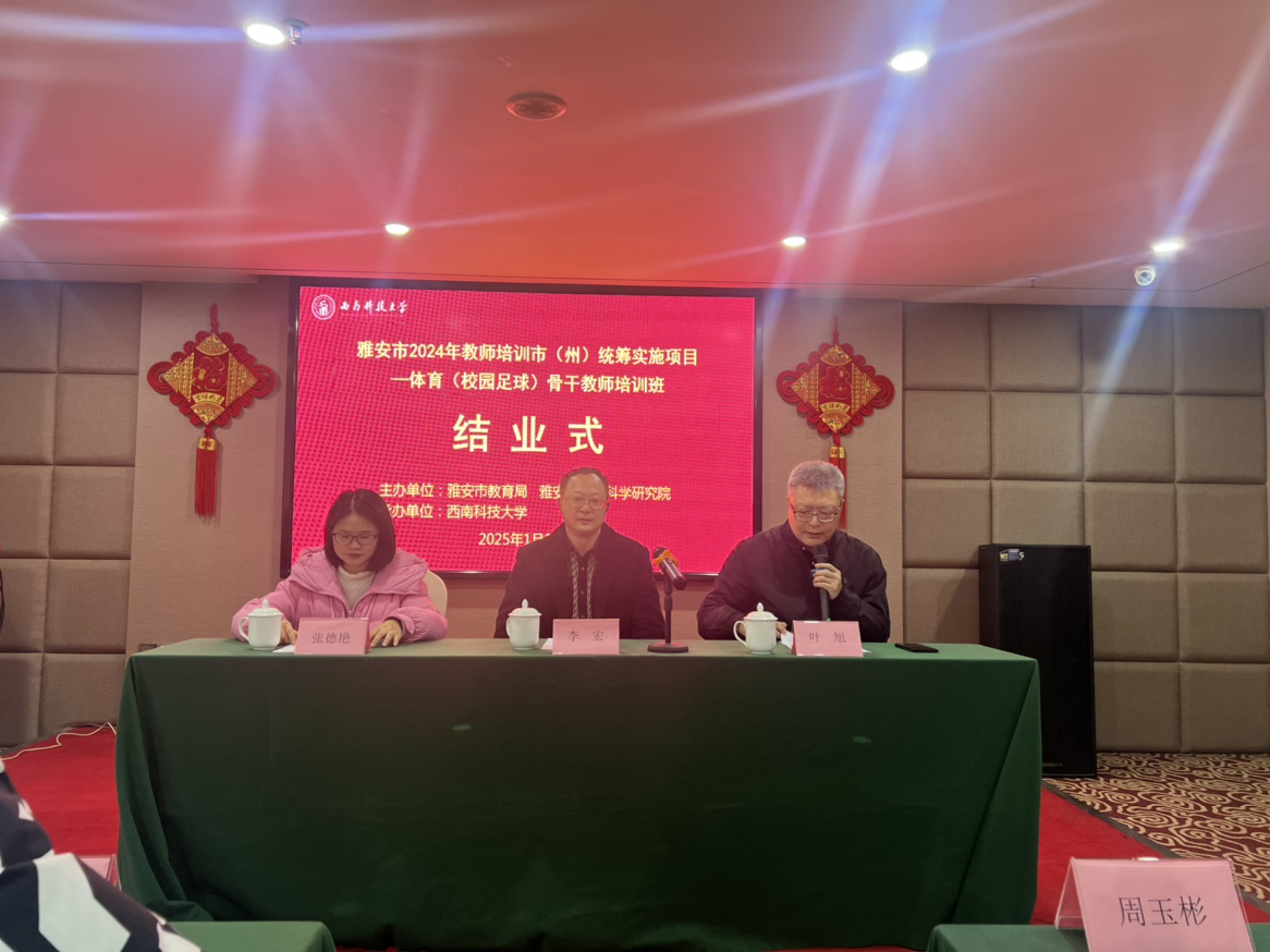 2025年1月21日,由雅安市教育局、雅安市教育科学研究院主办,金年会jinnianhuicom承办的雅安市2024年教师培训市(州)统筹实施项目—体育(校园足球)骨干教师培训班结业式在雅安市海伦酒店举行。雅安市教育科学研究院副院长李宏、雅安市教育科学研究院教研员张德艳、金年会jinnianhuicom金年会诚信信誉至上院长叶旭、培训班管理服务团队、后勤安全保障人员以及全体参训教师出席结业式。结业式由叶旭主持。