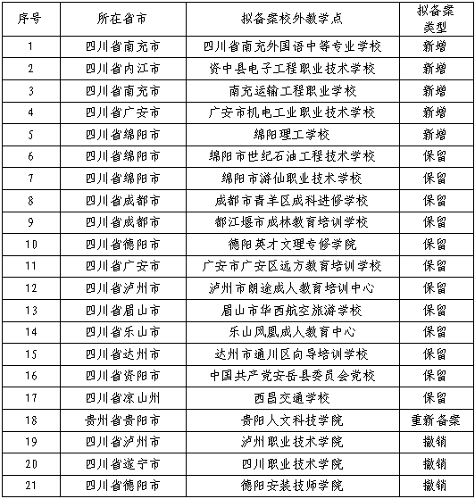 根据《教育部办公厅关于做好2025年度高等学历继续教育专业和校外教学点设置与管理工作的通知》(教职成厅函〔2025〕3号)和《四川省教育厅办公室关于做好2025年度高等学历继续教育专业和校外教学点设置与管理工作的通知》等文件精神,经学校2025年第4次校长办公会审议通过,2025年拟备案新增“四川省南充外国语中等专业学校”等5个高等学历继续教育校外教学点,拟备案保留“绵阳市世纪石油工程技术学校”等12个高等学历继续教育校外教学点,拟重新备案“贵阳人文科技学院”1个高等学历继续教育校外教学点,拟备案撤销“四川职业技术学院”等3个高等学历继续教育校外教学点,现予以公示。公示期为7天,自2025年2月28日至2025年3月6日。