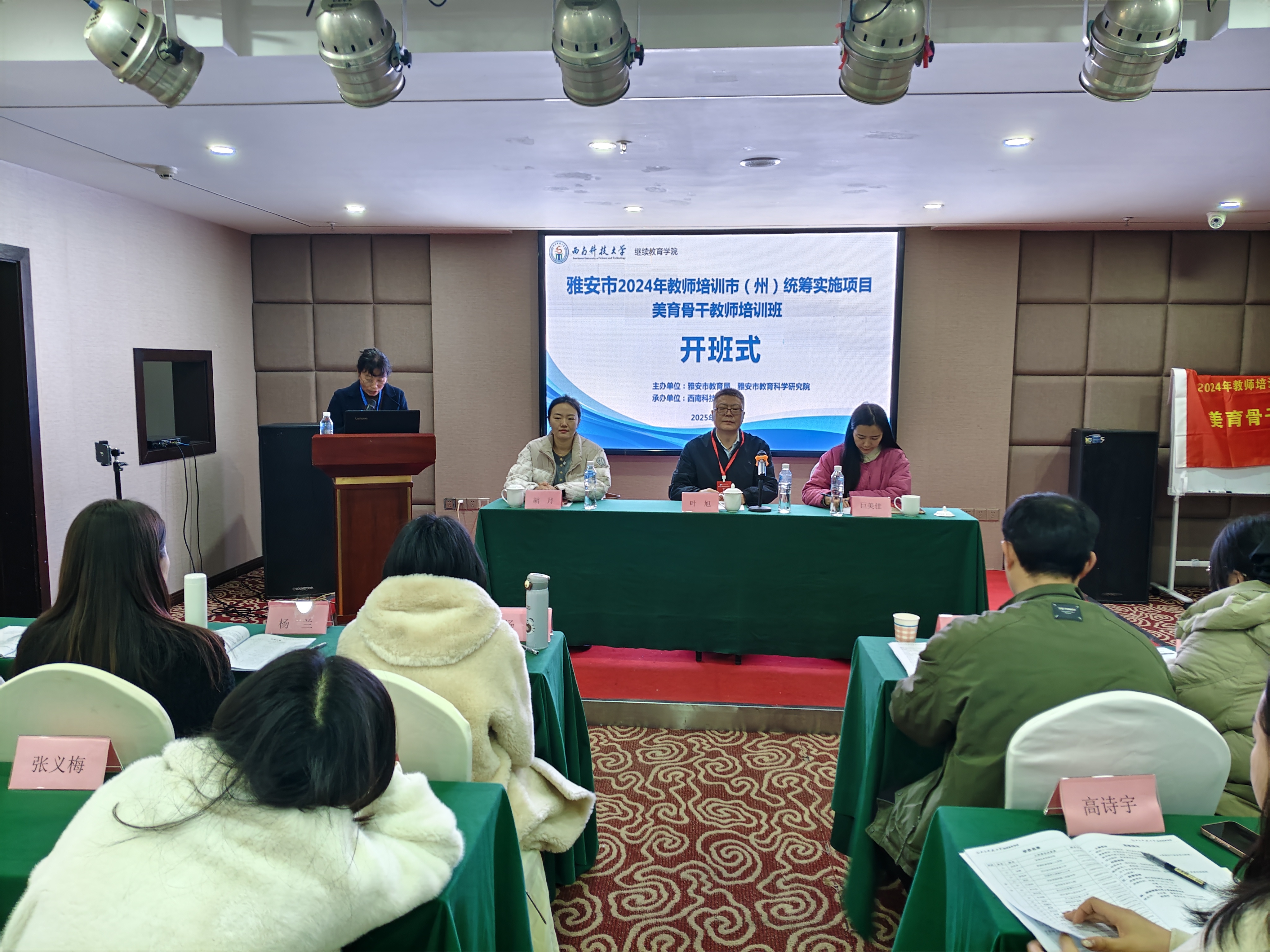 2025年3月6日,由雅安市教育局、雅安市教育科学研究院主办,金年会jinnianhuicom承办的雅安市2024年教师培训市(州)统筹实施项目—美育骨干教师培训班开班式在雅安市海伦酒店六楼会议室举行。雅安市教育科学研究院心理健康教育研究员胡月、雅安市教育科学研究院巨美佳、金年会jinnianhuicom金年会诚信信誉至上院长叶旭、培训班管理服务团队、后勤安全保障人员以及雅安市2区6县的40名美育骨干教师出席开班式。开班式由培训班班主任—金年会jinnianhuicom金年会诚信信誉至上王红妮主持。