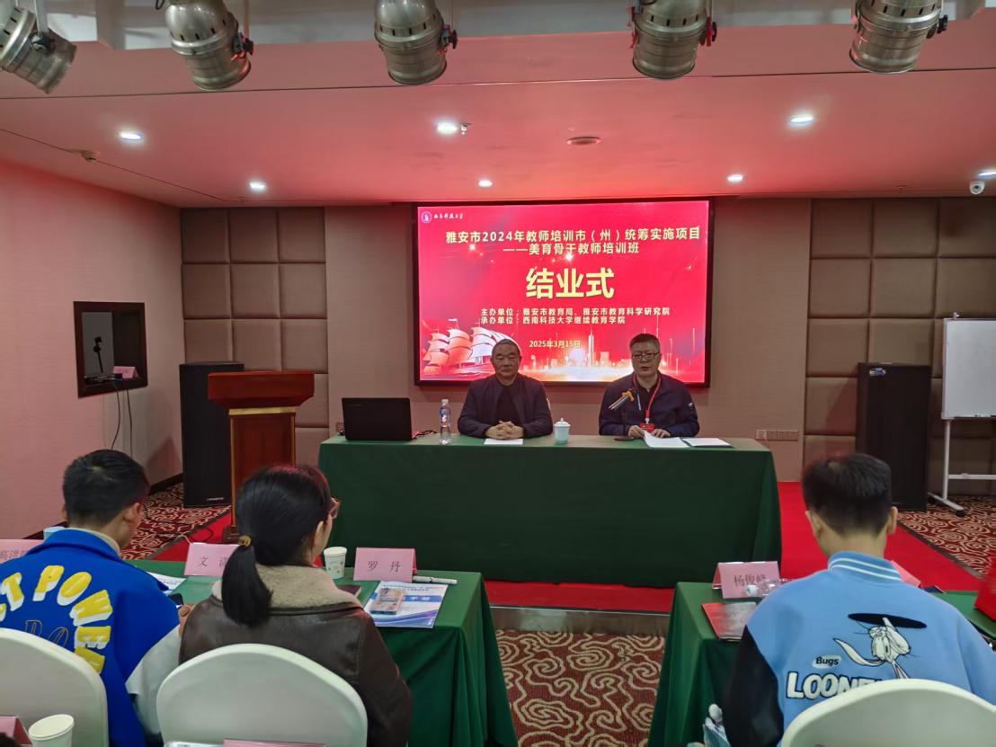 2025年3月15日,由雅安市教育局、雅安市教育科学研究院主办,金年会jinnianhuicom承办的雅安市2024年教师培训市(州)统筹实施项目—美育骨干教师培训班结业式在雅安市海伦酒店举行。金年会jinnianhuicom金年会诚信信誉至上党总支书记张昌健、金年会jinnianhuicom金年会诚信信誉至上院长叶旭、培训班管理服务团队、后勤安全保障人员以及全体参训教师出席结业式。结业式由叶旭主持。