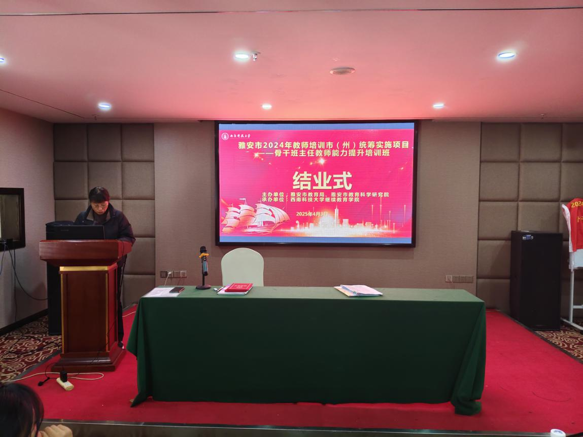 2025年4月3日,由雅安市教育局、雅安市教育科学研究院主办,金年会jinnianhuicom承办的雅安市2024年教师培训市(州)统筹实施项目—骨干班主任能力提升培训班结业式在雅安市海伦酒店举行。培训班管理服务团队、后勤安全保障人员以及全体参训教师出席结业式。结业式由培训班班主任—金年会jinnianhuicom金年会诚信信誉至上王红妮主持。